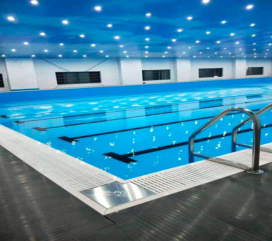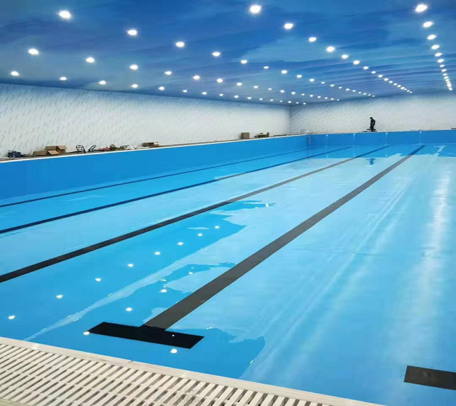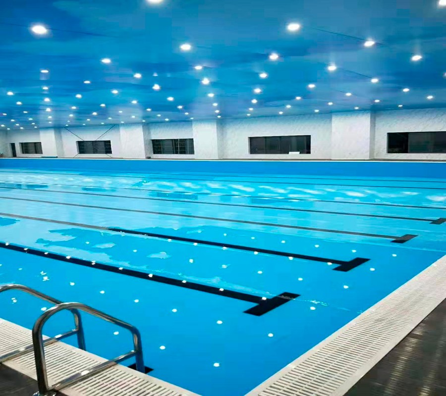湖南常德市安鄉(xiāng)縣道恩游泳健身—恒溫游泳館泳池施工結束。中廣拆裝式泳池(40*20*1.5m)+中廣水處理+中廣新風除濕+中廣歐特斯空氣能泳池恒溫+中廣軟膜天花防水吊頂。