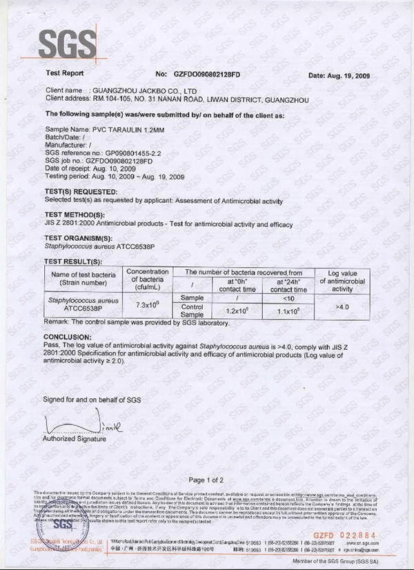 防水膜認證證書-抗菌性能1